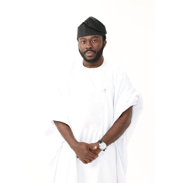 Introducing our signature Agbada to our dearest customers brings us great delight.Exude timeless grace and elegance with this White Agbada, featuring intricate embroidery that elevates its classic appeal. The crisp white fabric is adorned with meticulously crafted embroidery designs, adding a touch of artistry and sophistication to the flowing agbada. The wide sleeves and generous drape offer a regal presence, perfect for making a statement at any formal event or cultural celebration. Paired with a sleek Black Fila cap, this ensemble strikes the perfect balance between tradition and modern flair, making it an exceptional choice for the man who values style and heritage.